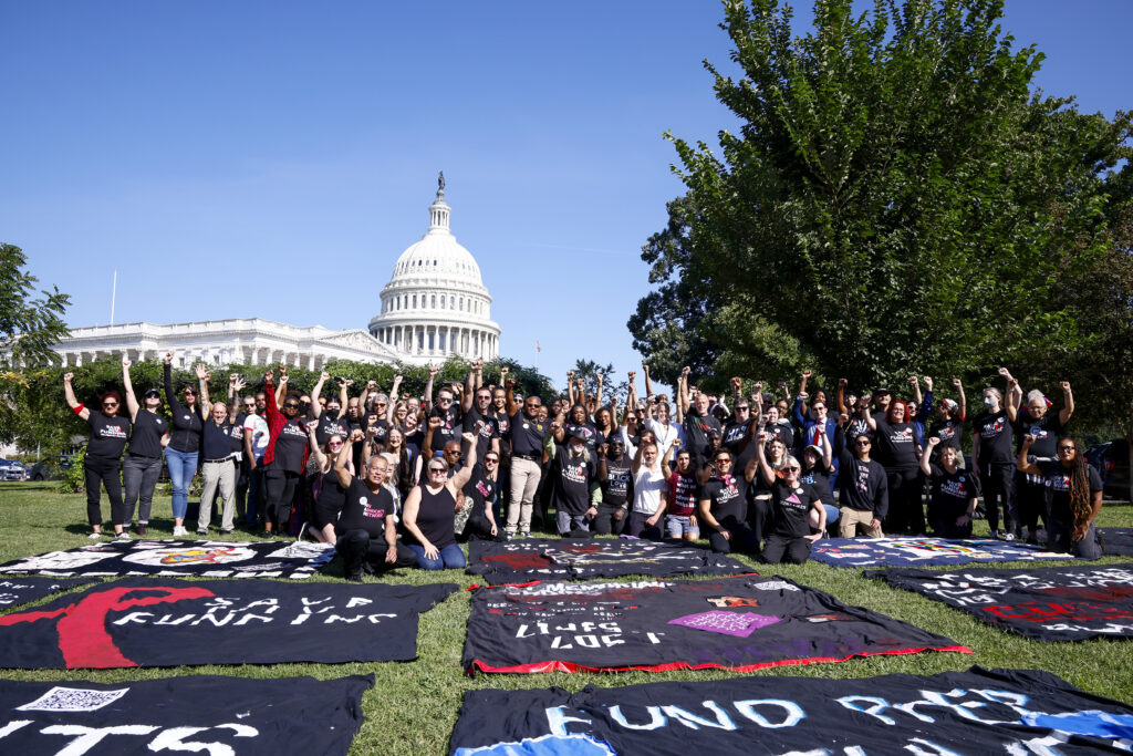 WASHINGTON, DC – SEPTEMBER 05: Organizers of the Save HIV Funding Campaign highlight the lives at stake if Congress fails to fund HIV services in the U.S. The quilt honors the past while warning Congress of the devastating consequences that could follow without immediate action to protect lifesaving healthcare. (Photo by Paul Morigi/Getty Images for Save HIV Funding Campaign)